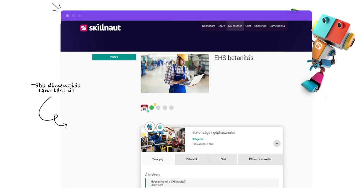 Automatikus megújulás és emlékeztetők, egyszerű nyilvántartás és auditokra szabott riportok – élvezd a Skillnaut automatizmusait a kötelező oktatások terén. Legyen szó munkavédelemről, GDPR-ról vagy etikai kódexről, a rendszer biztosítja, hogy senki ne maradjon ki, és minden vizsga dokumentálva legyen.
